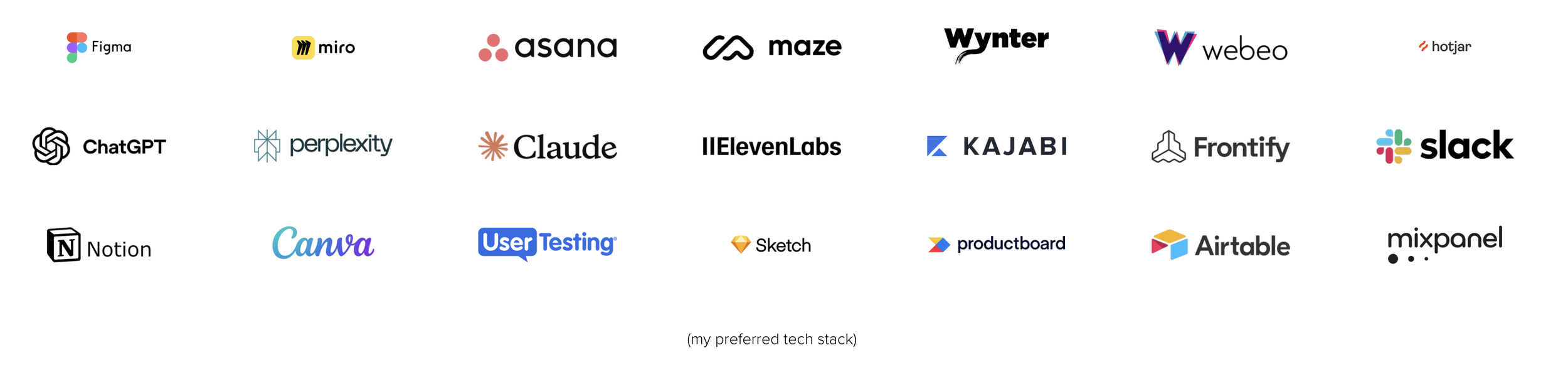 I use modern product design and research tools including Figma, Sketch, Miro, Maze, Hotjar, Clarity, UserTesting, and analytics platforms. I use tools pragmatically, choosing what best supports learning, speed, and collaboration.